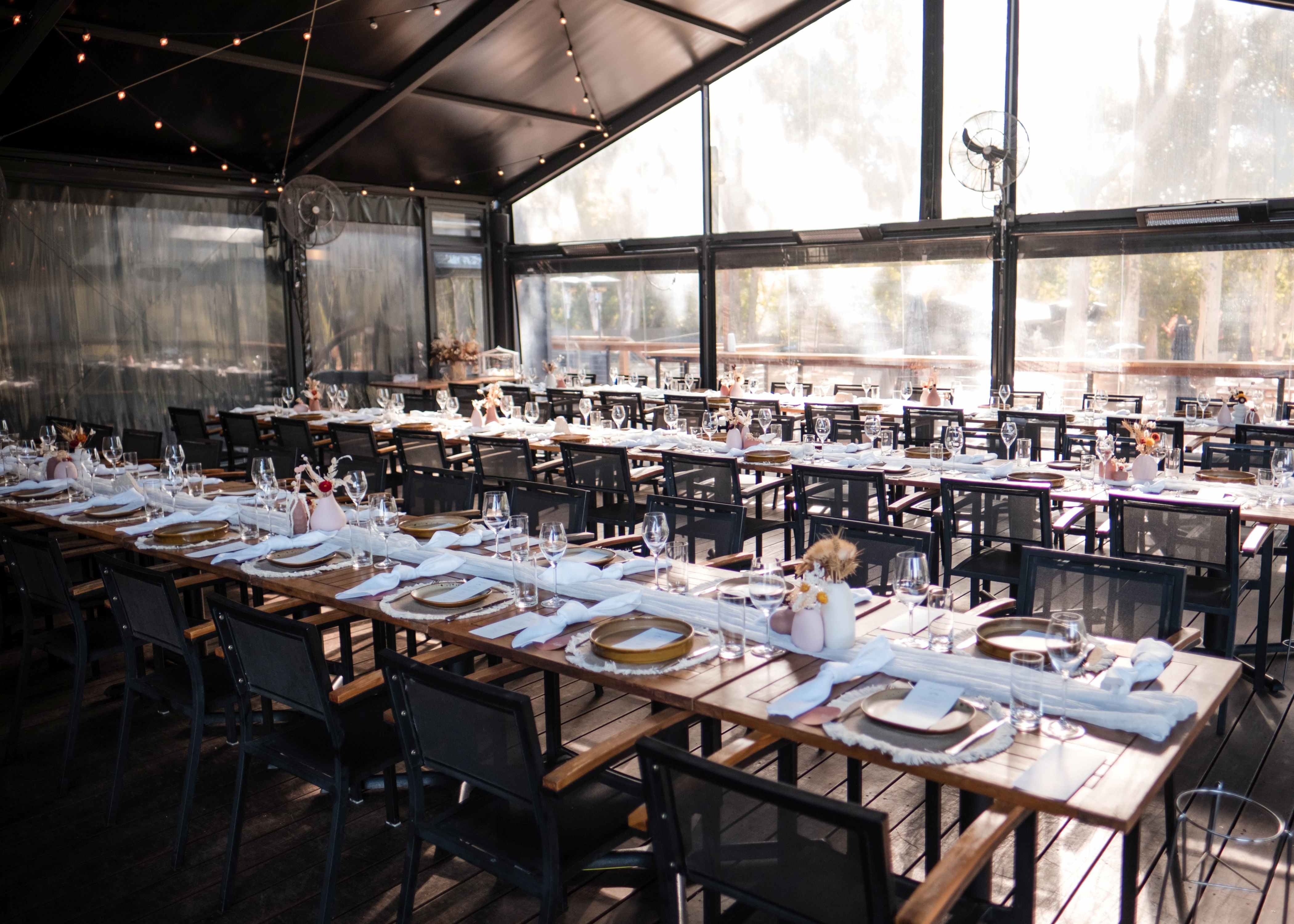 The interior extends outside to an enormous hardwood deck catering to small and large group dining, under the shade of our marquee equipped with heaters for winter and misting fans for summer.