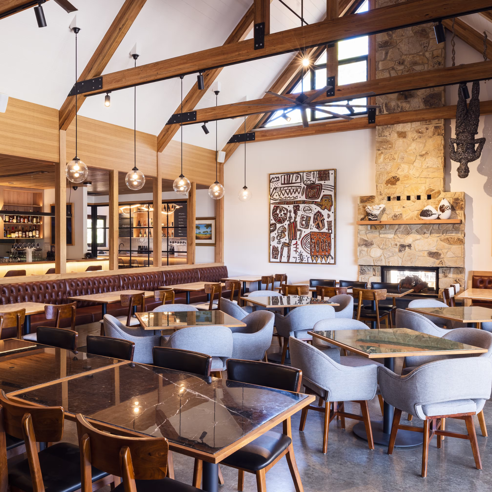 Set amongst a stunning mix of eucalyptus and landscaped gardens, the Sidewood Restaurant is only a 25-minute drive from the CBD. The luxury landmark’s vast jet-black cladded exterior and 45-degree pitch gable roofline stands in contrast to warm, natural materials of the interior, including giant Victoria ash trusses, local stone flooring and warm caramel leather banquettes. The venue also features an eclectic collection of Australian art, including the works by Oslen, Blackman, Boissevain and Grey Smith.